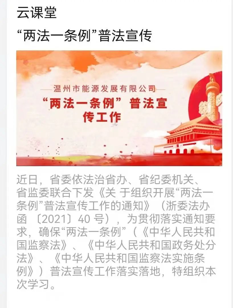 同時,公司還在釘釘云課堂中開展“兩法一條例”的宣傳學習打卡,并在學習之后進行線上知識測試。